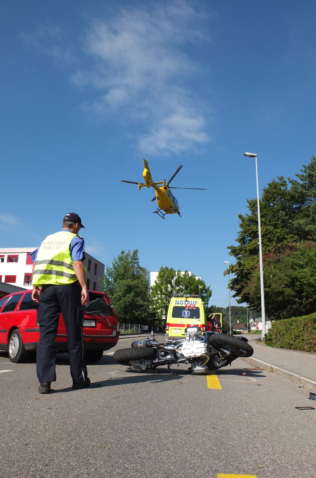Ein Rettungshelikopter flog den Motorradfahrer mit Verdacht auf Rückenverletzungen ins Spital. Der Automobilist, ein 54-jähriger Kosovare, blieb unverletzt. Am Motorrad und am Auto entstand grosser Sachschaden.