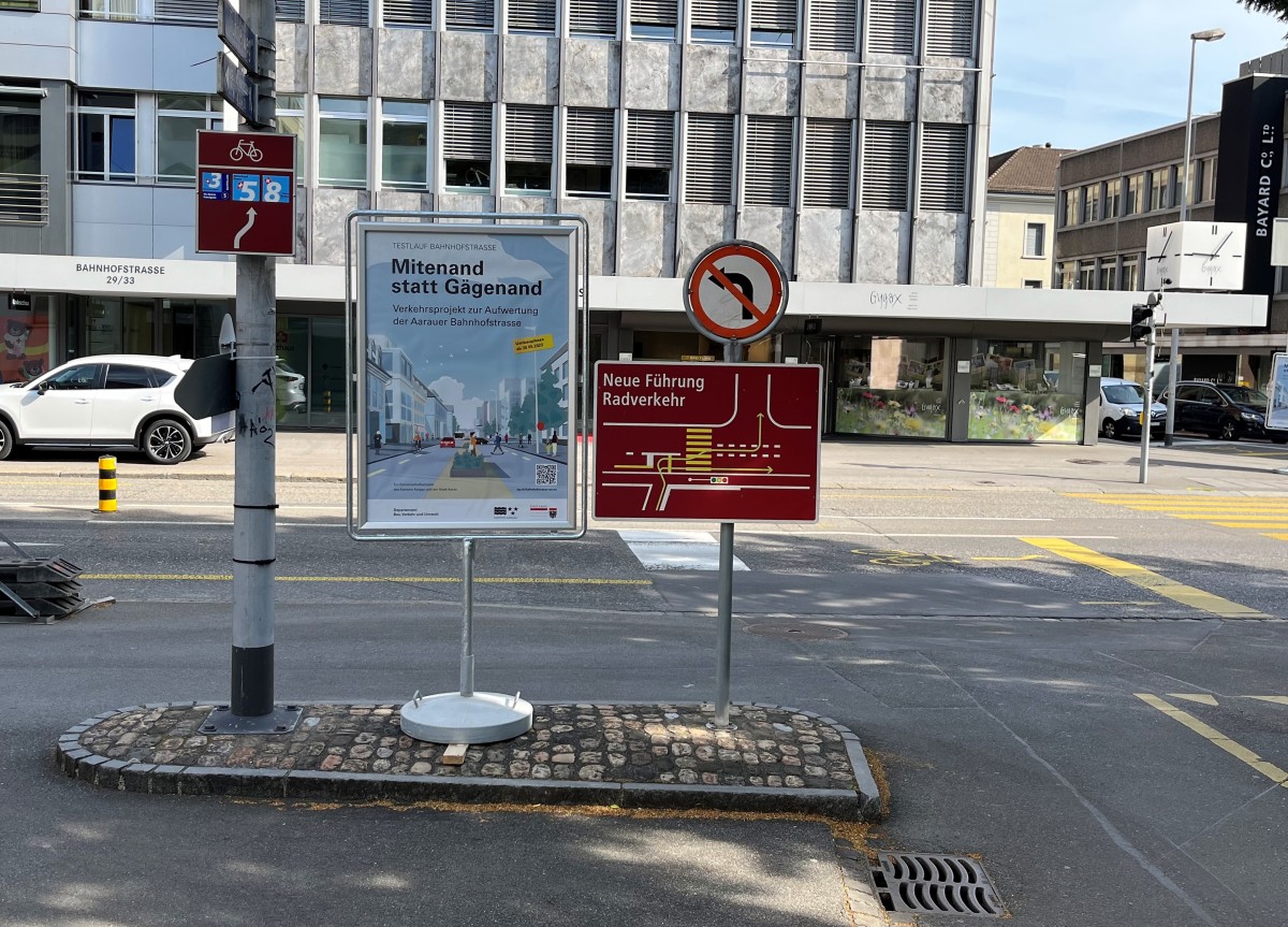 Am Dienstag, 30. Mai 2023, starten die Umbauarbeiten zum Testlauf "Mitenand statt Gägenand" in der Aarauer Bahnhofstrasse. Dabei werden die Bushaltestellen verschoben und ausgebaut sowie die Trottoirüberfahrten über die Bank- und Kasernenstrasse erstellt. Die Bauarbeiten dauern zweieinhalb Monate, so dass der eigentliche Testlauf Mitte August 2023 starten kann.