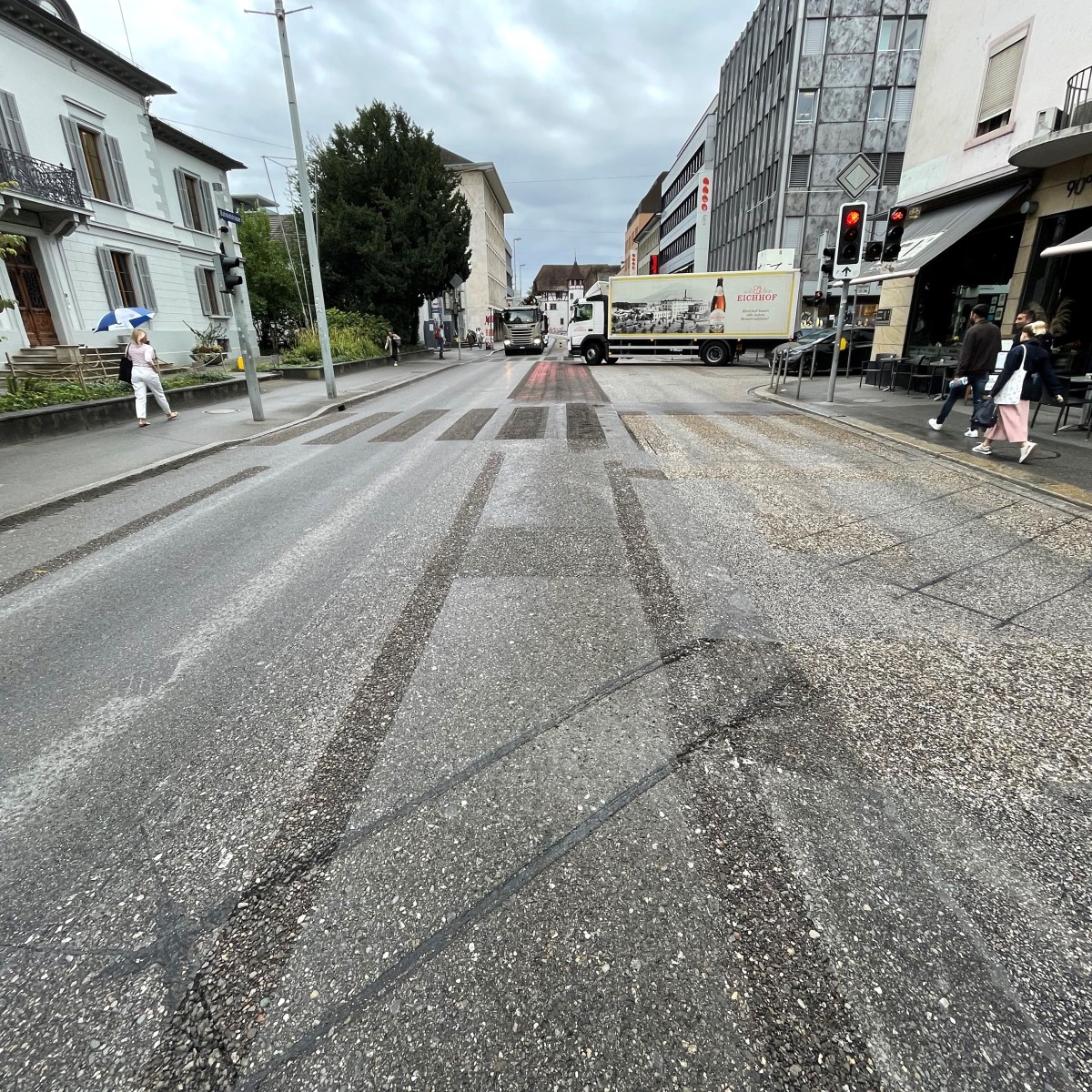 Die Arbeiten für den Testlauf an der Bahnhofstrasse in Aarau laufen auf Hochtouren. In der Nacht vom 8. auf den 9. August 2023 wurde die komplette Strassenmarkierung entfernt.