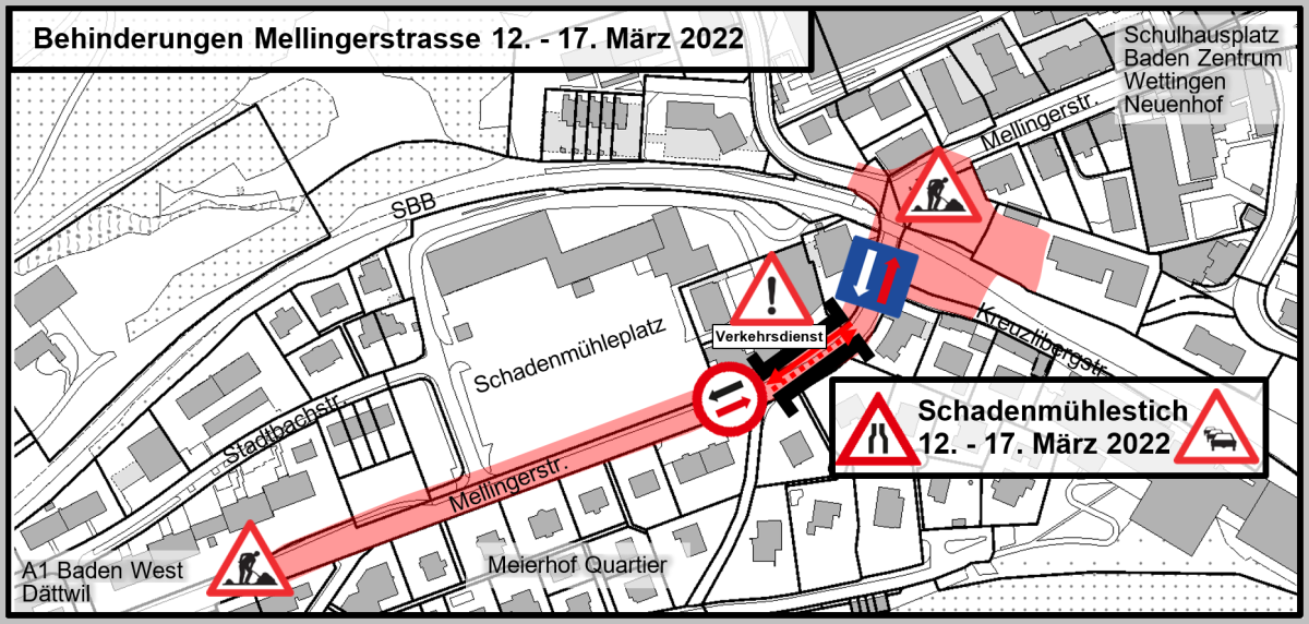 Behinderungen ab 12. März 2022 beim Schadenmühlestich in Baden aufgrund von Belagsarbeiten