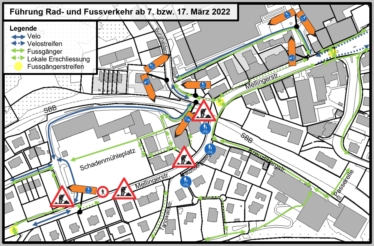 Dafür wird ein Einbahnregime auf der Burghaldenstrasse eingerichtet: Die Ausfahrt von der Burghaldenstrasse in die Mellingerstrasse ist vom Montag, 7. März, bis Freitag, 25. März 2022, für den Motorfahrzeugverkehr gesperrt. Der wegfahrende Verkehr aus dem Allmend-, Belvedere-, Burghalden- und Münzlishausenquartier wird via Allmend- und Rütistrasse bis zur Kreuzung Bruggerstrasse umgeleitet.