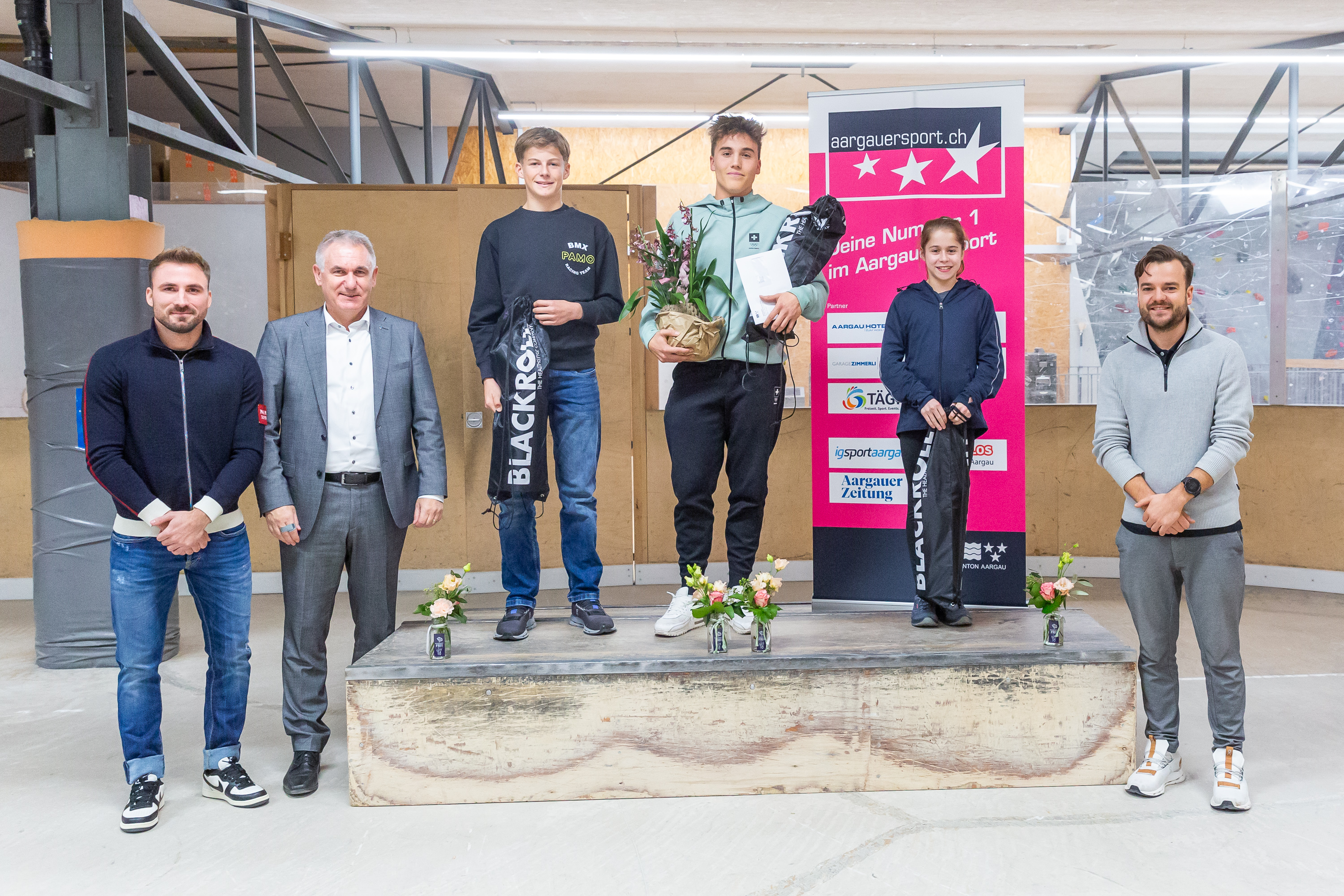 (v. l. n. r.): Noel Ott (letztjähriger Gewinner), Regierungsrat Alex Hürzeler, Jules Kasper (Zweitplatzierter), Lionel Brügger (Erstplatzierter), Lia Schumacher (Drittplatzierte), Tobias Steinemann (Cool and Clean Botschafter)