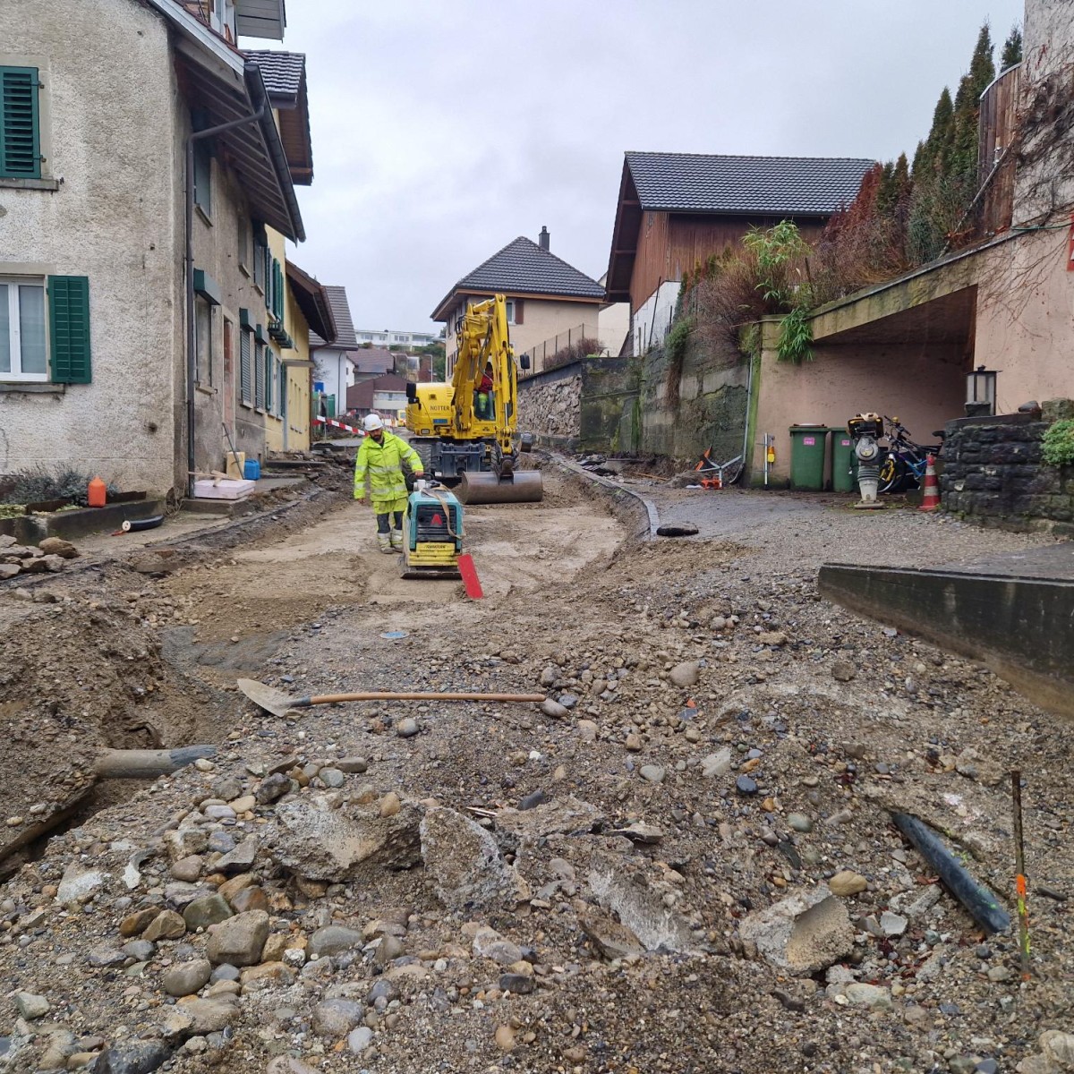 Die Baustelle kann aus dem zügigen Ablauf der 1. und 2. Bauetappe profitieren und wird voraussichtlich im März 2024 abgeschlossen. Voraussichtlich kann die Oberdorfstrasse am 25. März 2024 wieder für den Verkehr freigegeben werden kann. Das ist eine Bauzeitverkürzung um gut vier Monate, denn der ursprüngliche Terminplan sah eine Baustellentätigkeit bis Juli 2024 vor. Neben dem guten Wetter im Sommer 2023 konnte die Baustelle auch in einem hohen Mass von der guten und vorausschauenden Zusammenarbeit aller beteiligten Firmen, der Bauleitung und der Bauherrschaften profitieren.