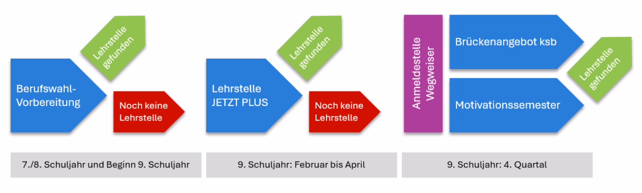 Die Anmeldung für eine Zwischenlösung erfolgt erst dann, wenn die Chancen für einen direkten Einstieg in eine Berufslehre nicht mehr realistisch sind und auch eine allfällige in Anspruch genommene Unterstützung durch Lehrstelle JETZT PLUS nicht gegriffen hat.