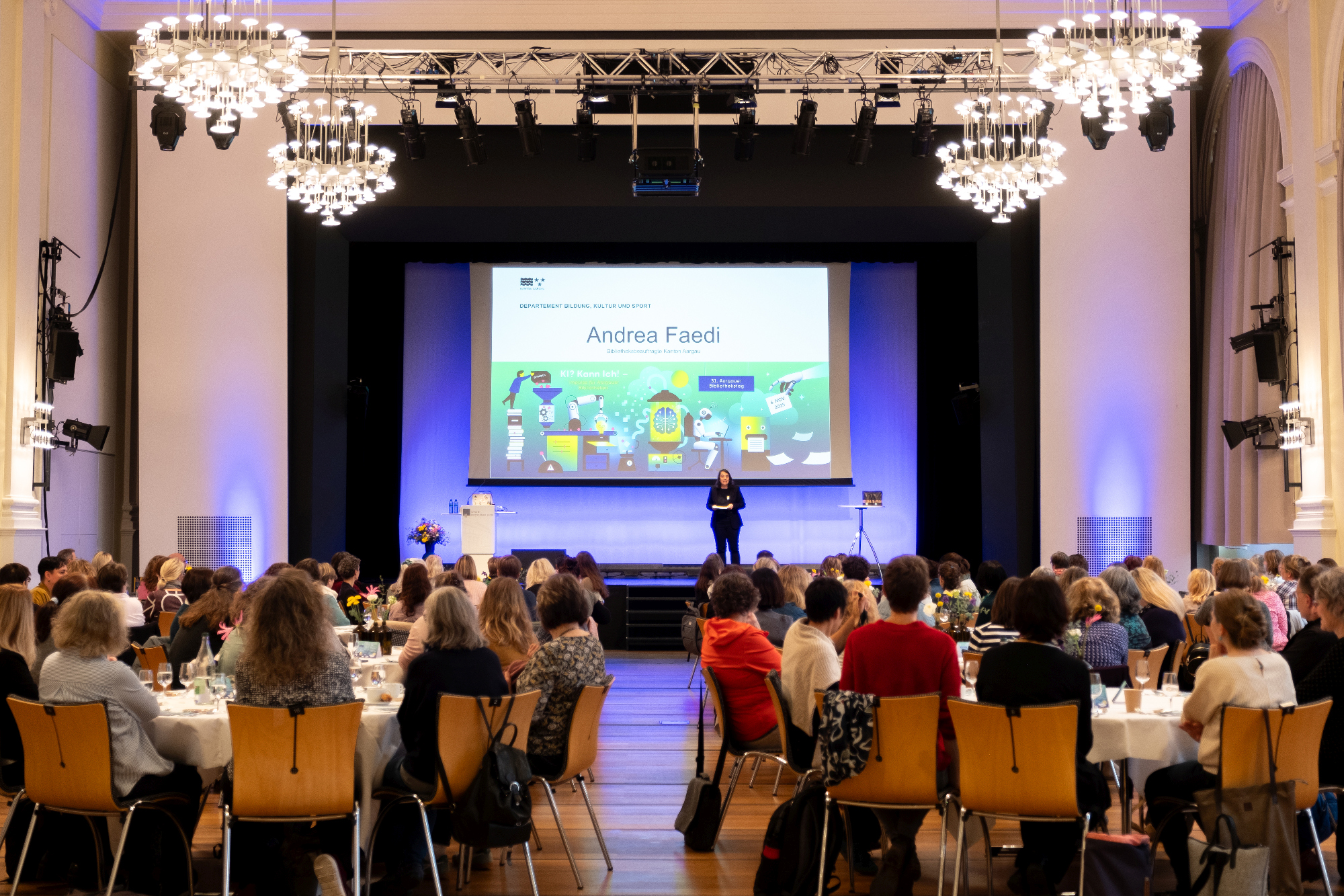 Der 31. Aargauer Bibliothekstag im Kultur- und Kongresshaus Aarau (KuK) stand ganz im Zeichen der Künstlichen Intelligenz. Unter dem Motto "KI? Kann ich! – Impulse für Aargauer Bibliotheken" beschäftigten sich rund 150 Bibliotheksmitarbeitende aus dem ganzen Kanton mit einem Thema, das ihren Berufsalltag bereits heute prägt und in den kommenden Jahren weiter an Bedeutung gewinnen wird. Dass die Tagung vollständig ausgebucht war, zeigt eindrücklich, wie stark das Thema KI die Bibliotheken bewegt.
