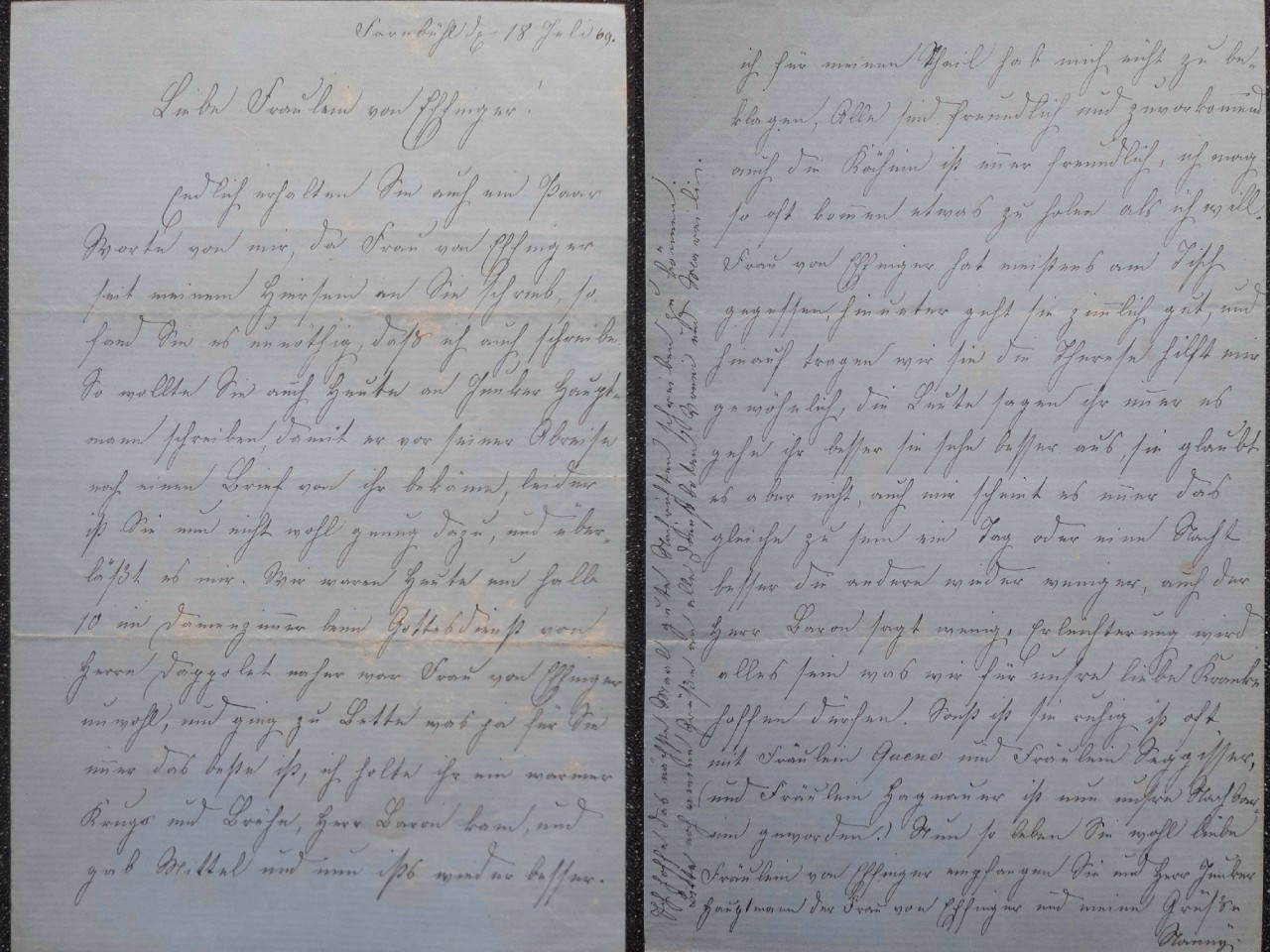 Farnbühl den 18 Juli 69. Liebe Fraulein von Effinger! Endlich erhalten Sie auch ein Paar Worte von mir, da Frau von Effinger seit meinem Hiersein an Sie schrieb, so fand Sie es unnöthig, dass ich auch schreibe. So wollte Sie auch heute an Junker Hauptmann [Julies Vater Rudolf] schreiben, damit er vor seiner Abreise noch einen Brief von ihr bekäme, leider ist Sie nun nicht wohl genug dazu, und überlässt es mir. Wir waren heute um halb 10 im Damenzimmer beim Gottesdienst von Herrn Dappolet naher [nachher] war Frau von Effinger unwohl, und ging zu Bette was ja für Sie immer das beste ist, ich holte ihr ein warmer Krugs und Brühe, Herr Baron kam, und gab Mittel und nun ists wieder besser. […] Ich für meinen Theil hab mich nicht zu beklagen, Alle sind freundlich und zuvorkommend auch die Köchin ist immer freundlich, ich mag so oft kommen etwas zu holen als ich will. Frau von Effinger hat meistens am Tisch gegessen, hinunter geht sie zimmlich gut, und hinauf tragen wir sie die Therese hilft mir gewöhnlich, die Leute sagen ihr immer es gehe ihr besser sie sehe besser aus, sie glaubt es aber nicht, auch mir scheint es immer das gleiche zu sein ein Tag oder eine Nacht besser die andere wieder weniger, auch der Herr Baron sagt wenig, Erleichterung wird alles sein was wir für unsre liebe Kranke hoffen dürfen. Sonst ist sie ruhig ist oft mit Fräulein Quene und Fraulein Seggisser, (und Fräulein Hagnauer ist nun unsre Nachbarinn geworden.) Nun so leben Sie wohl liebe Fräulein von Effinger empfangen Sie und Herr Junker Hauptmann der Frau von Effinger und meine Grüsse. Nanny Ich hoffe das nächste Maal gute Nachrichten schreiben zu können. Bitte noch unsere Grüsse an alle Dienstboten Vreni und Mareili