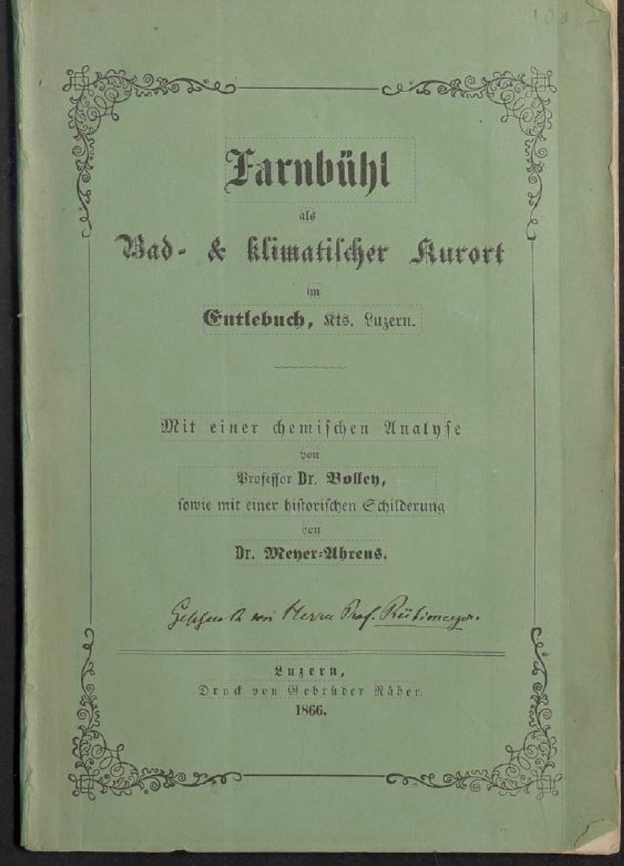 In der Kapelle – auf dem ersten Bild im Hintergrund links – wurde am Sonntag Gottesdienst gehalten. Aus der Broschüre besonders zu erwähnen: auch eine Pflanzenliste für das damals modische Botanisieren wurde den Leserinnen und Leser zur Verfügung gestellt. Die Lebensdauer des Bads war kurz: 1900 ging es Konkurs, 1906 brannte das Kurhotel Farnbühlbad bis auf die Grundmauern nieder.