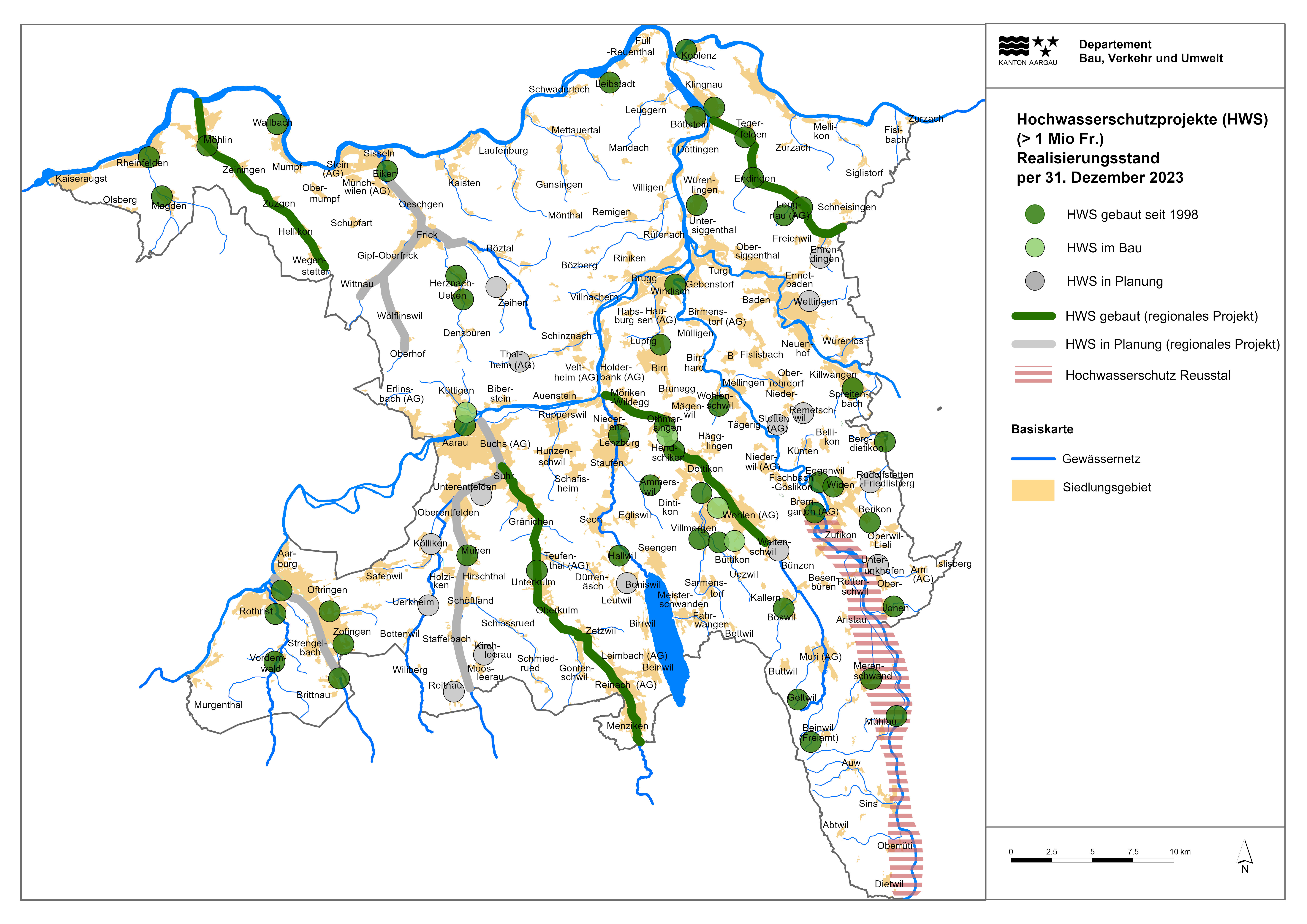 | Weitere Informationen | Projekthomepage Abteilung Landschaft und Gewässer Übersichtskarte Hochwasserschutzprojekte im Kanton Aargau, Stand 2024 (JPG, 3,2 MB) Verhaltensempfehlungen Hochwasser |