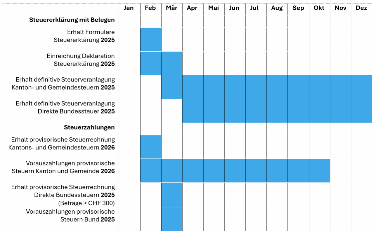 Die provisorische Steuerrechnung ist zahlbar bis Ende Oktober. Zahlungen vor diesem Zeitpunkt werden verzinst. Beachten Sie, dass auch provisorische Steuerrechnungen betrieben werden können.