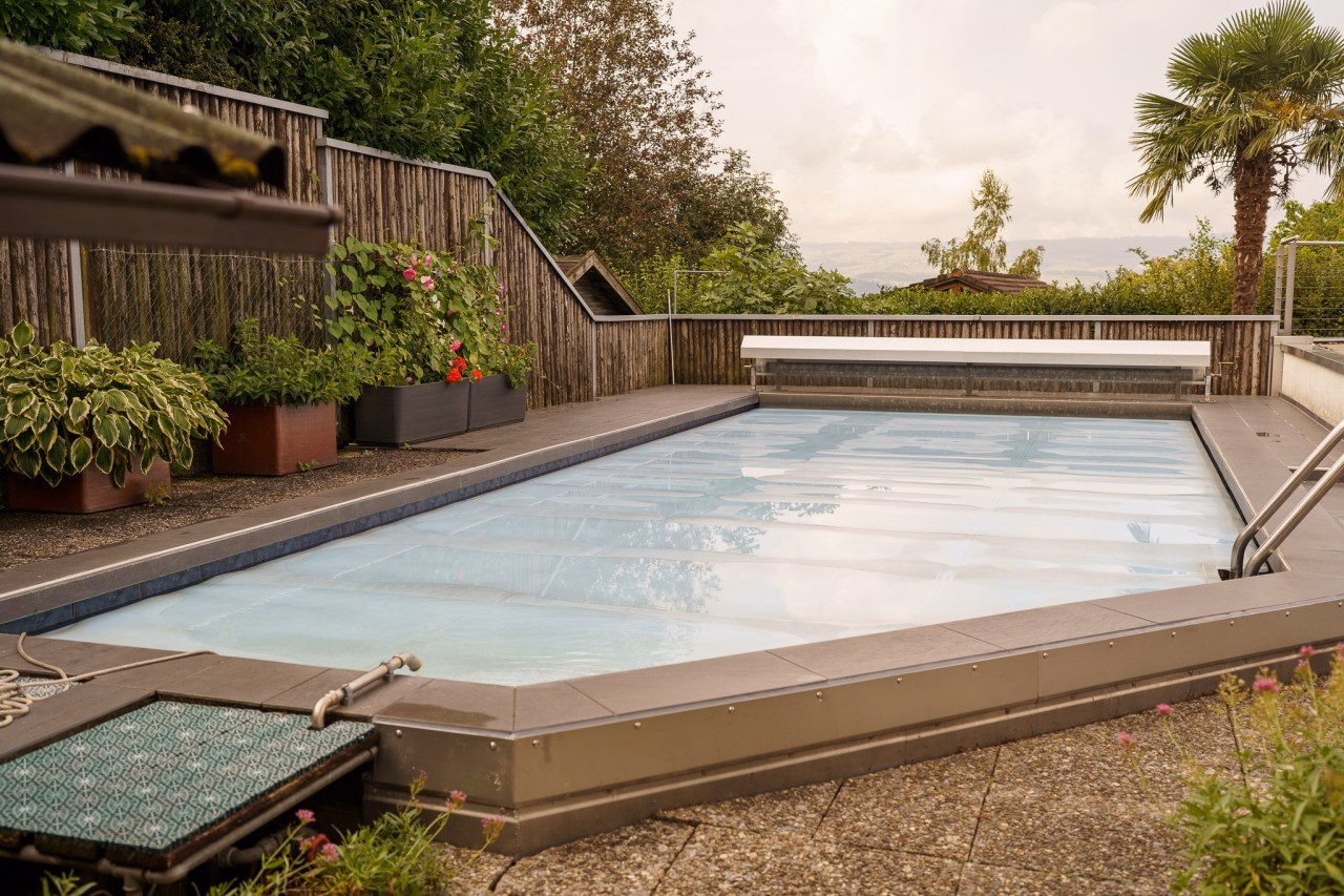 Ein weiteres Highlight ist der Pool: Bevor das Regenwasser darin landet, fliesst es durch schwarze Röhrchen auf dem Dach – sogenannte Solarabsorber. Dieser Eigenbau stammt ebenfalls von Fritz Brun und wurde bereits vor 55 Jahren installiert. So wird das Wasser kostenlos durch die Sonne erwärmt