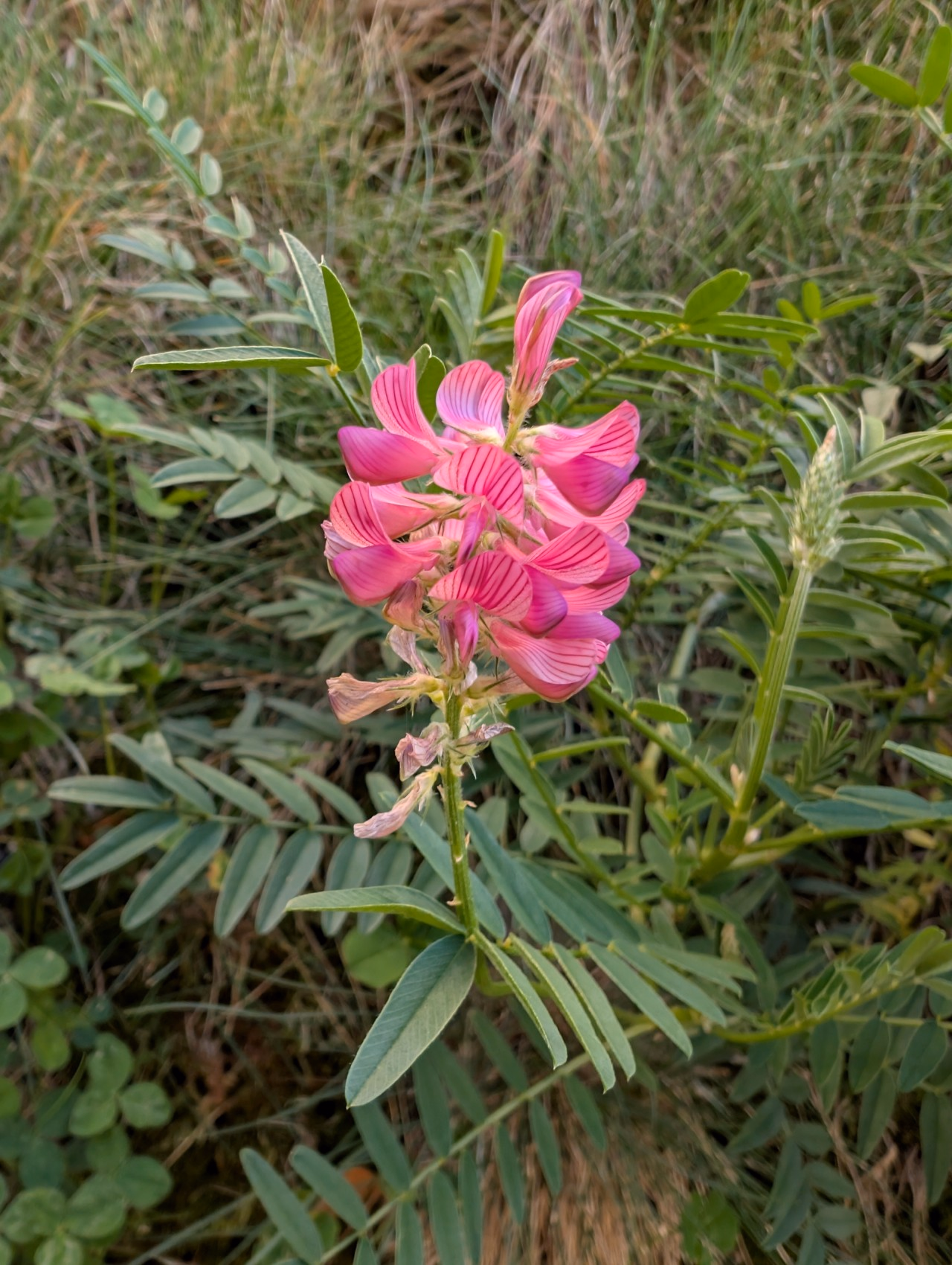 Die Blüten der Saat-Esparsette sind, im Vergleich zu den Blüten der Geissraute, richtig kräftig gefärbt. Zudem ist die Blütenfarbe eher rosa und die Blüten sind gestreift. © Kanton Aargau