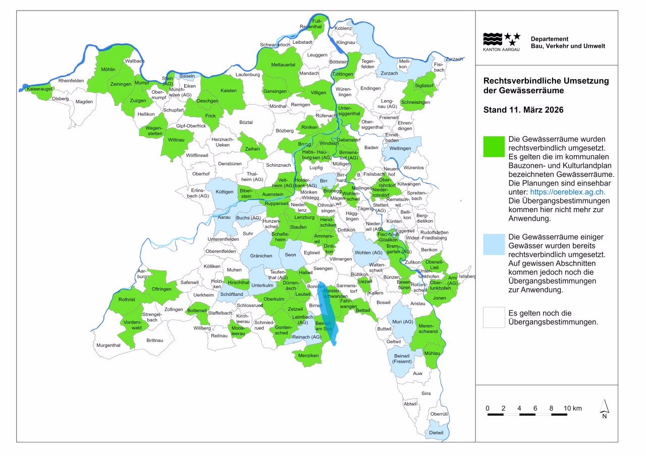 Baugesuche für Bauten, die ganz oder teilweise im Gewässerraum liegen, bedürfen einer Zustimmung des Departements Bau, Verkehr und Umwelt des Kantons Aargau (Abteilung für Baubewilligungen). Diese Baugesuche müssen mit dem Hinweis auf den Gewässerraum zudem im kantonalen Amtsblatt publiziert werden.