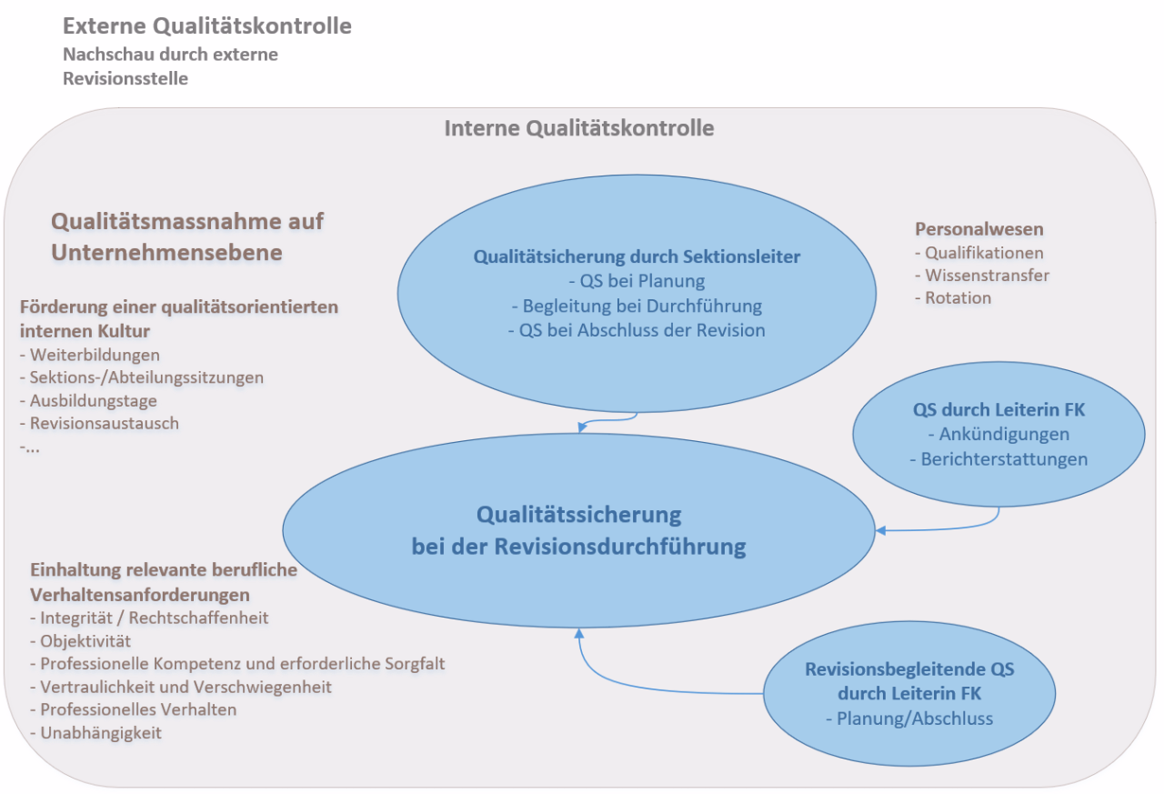 Ziel einer guten, funktionierenden Qualitätssicherung ist es, angemessen Gewähr dafür zu bieten, dass von allen Mitarbeitenden sowohl die fachlichen Normen als auch die gesetzlichen und sonstigen Vorschriften eingehalten werden. Die Qualitätssicherung soll gewährleisten, dass die von der Finanzkontrolle herausgegebenen Berichte sachgerecht sind. Im Grundsatz kann unterschieden werden zwischen der internen und der externen Qualitätskontrolle. In der Grafik 6 wird die Qualitätssicherung bei der Finanzkontrolle bildlich dargestellt.