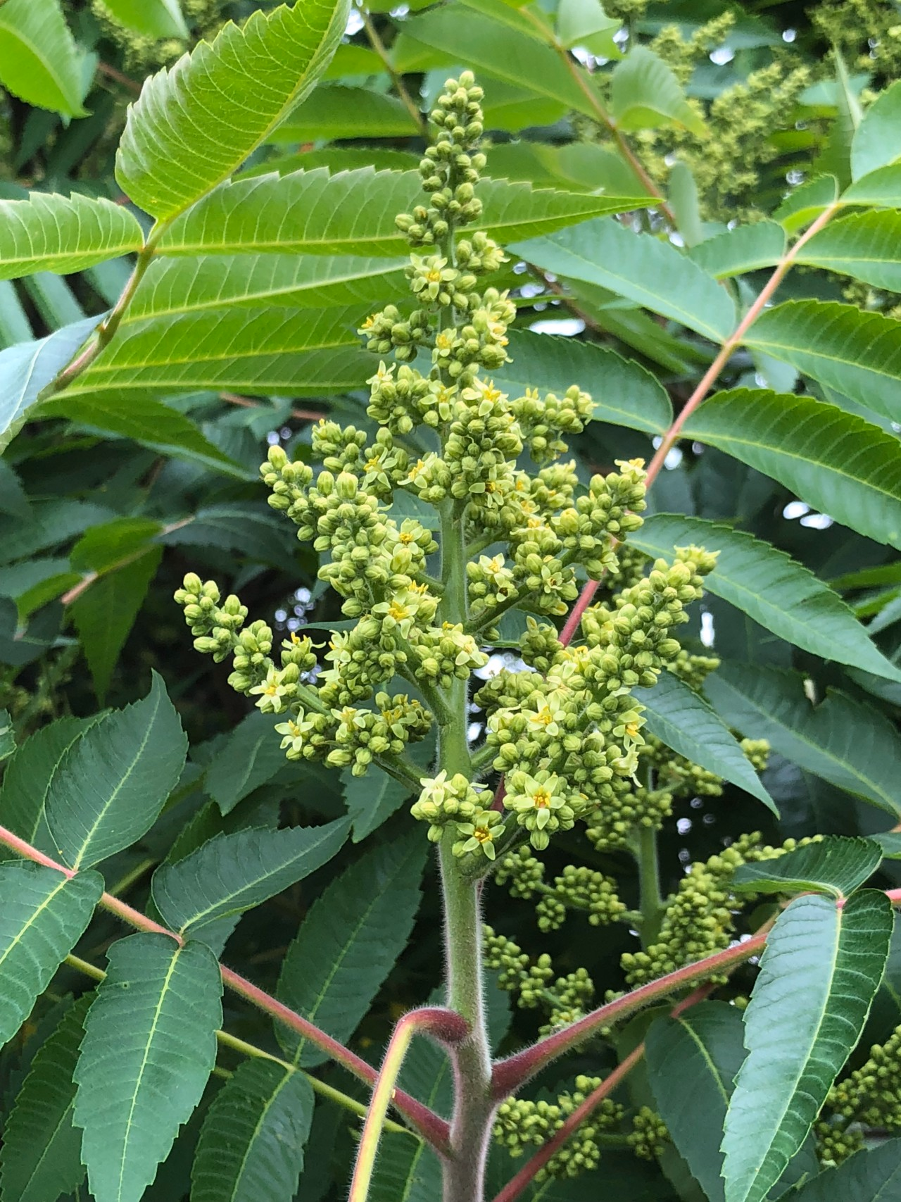 Im Vergleich zu seinen Früchten sind die Blüten des Essigbaums relativ unscheinbar. Sie sind klein, grün und radiärsymmetrisch aufgebaut. © Erwin Jörg