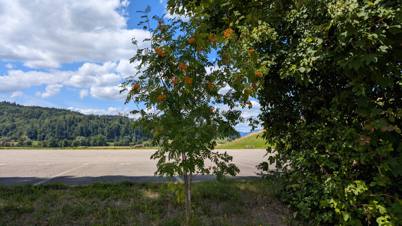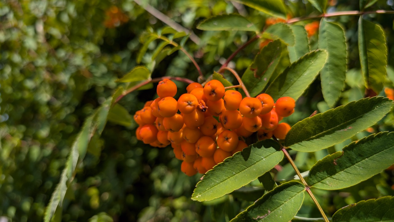 Die Früchte der Vogelbeere sind orange bis rot und kugelig, aber im Gegensatz zu denen des Essigbaums kahl. Zudem sind sie in einer Schirmrispe (also eher flächig) angeordnet. © Kanton Aargau